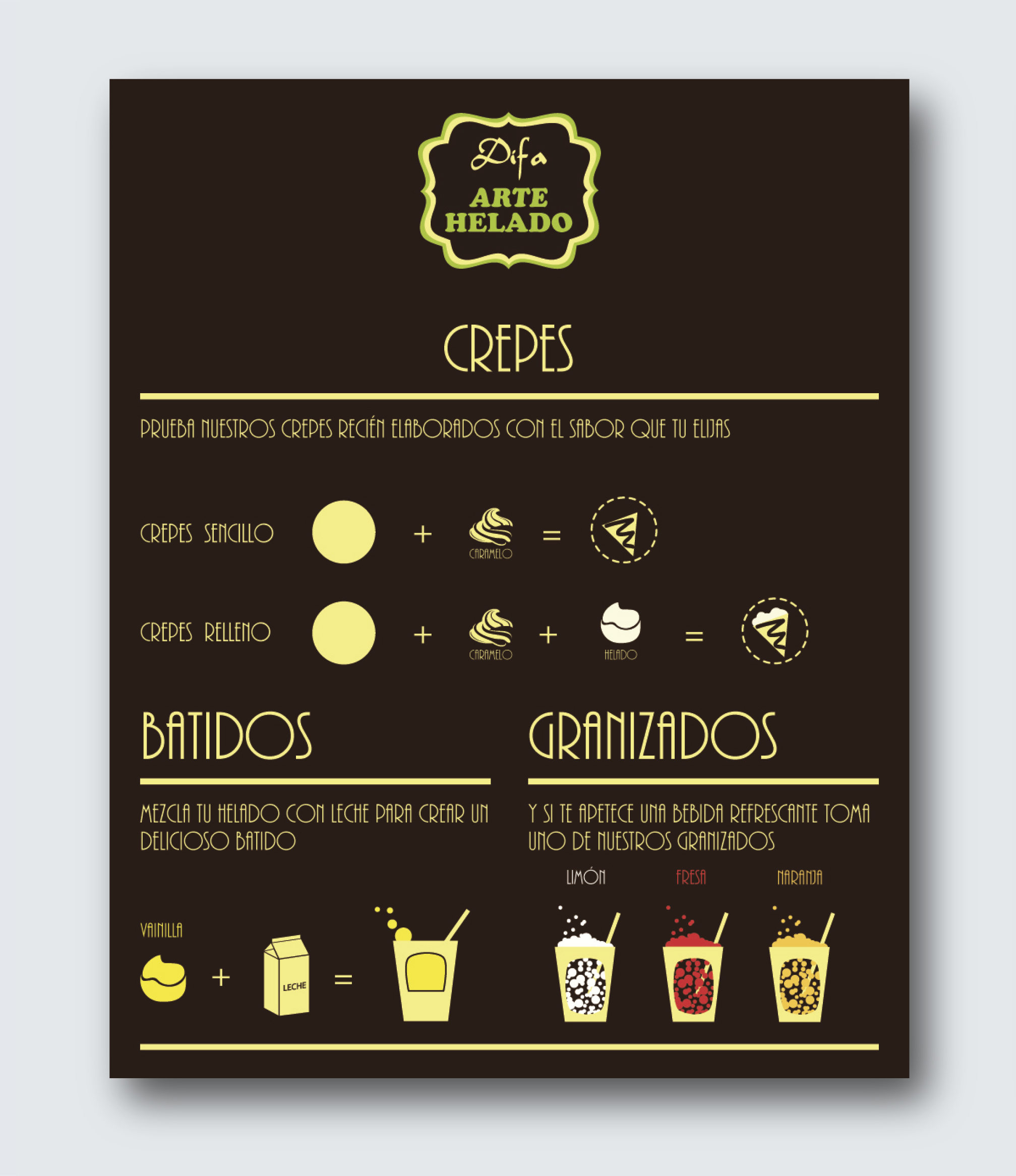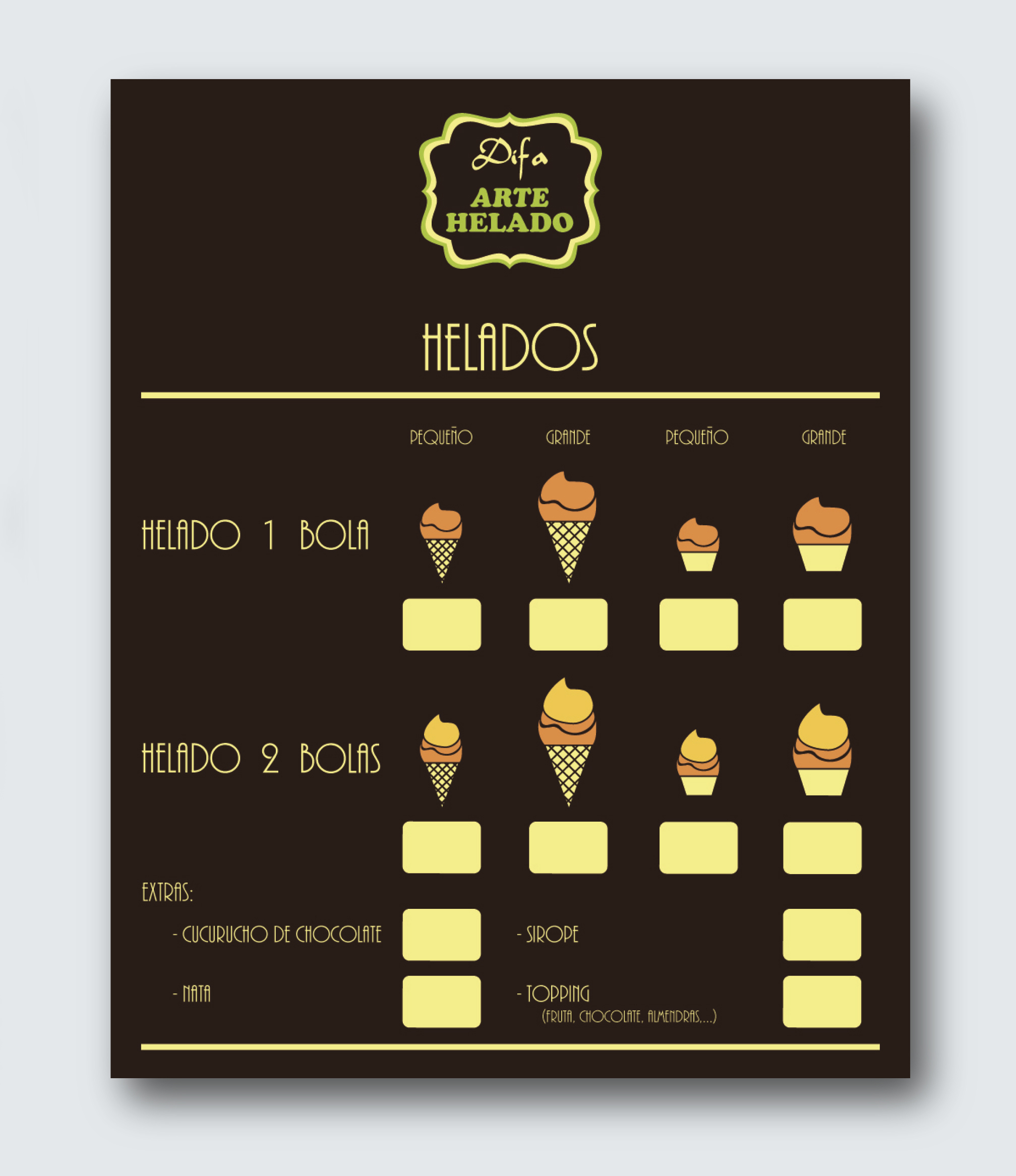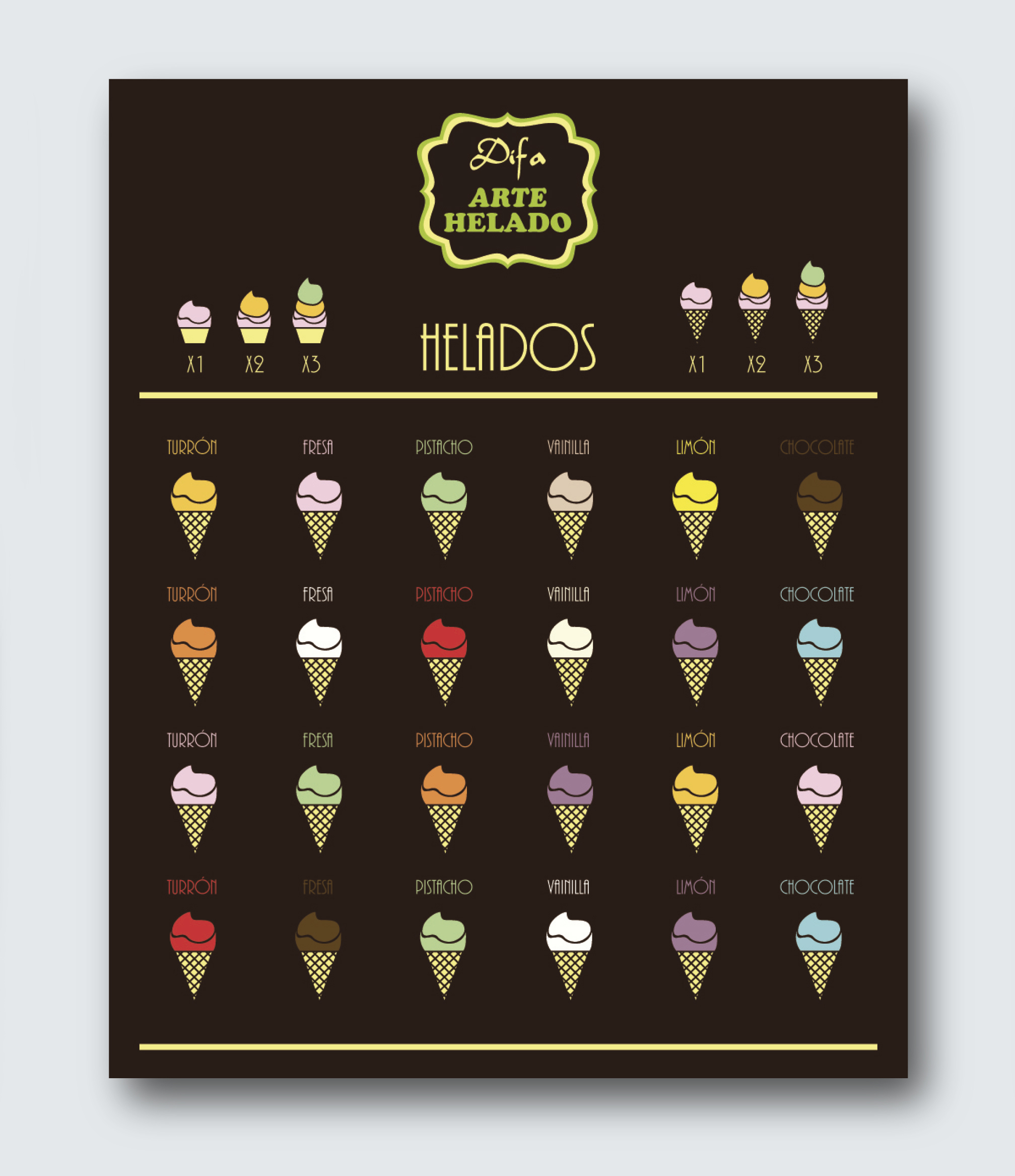 El cliente nos encarga el diseño de una heladería en la playa de Melenara, Telde, para la cual es necesario realizar toda la cartelería de los productos en venta.