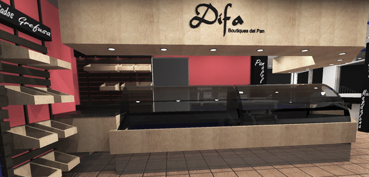 La empresa "Difa boutique´s del pan", con multitud de tiendas en la isla de Gran Canaria, pretende hacer un cambio de imagen de todos sus comercios con el fin de conseguir una imagen homogénea y actual. El cliente quiere conservar todas sus neveras de venta al público por lo que optamos en forrarlas con la misma madera, de igual modo proyectamos sobre las paredes unas lamas de madera donde se encajan unos cajones de madera iluminados para la venta de pan.