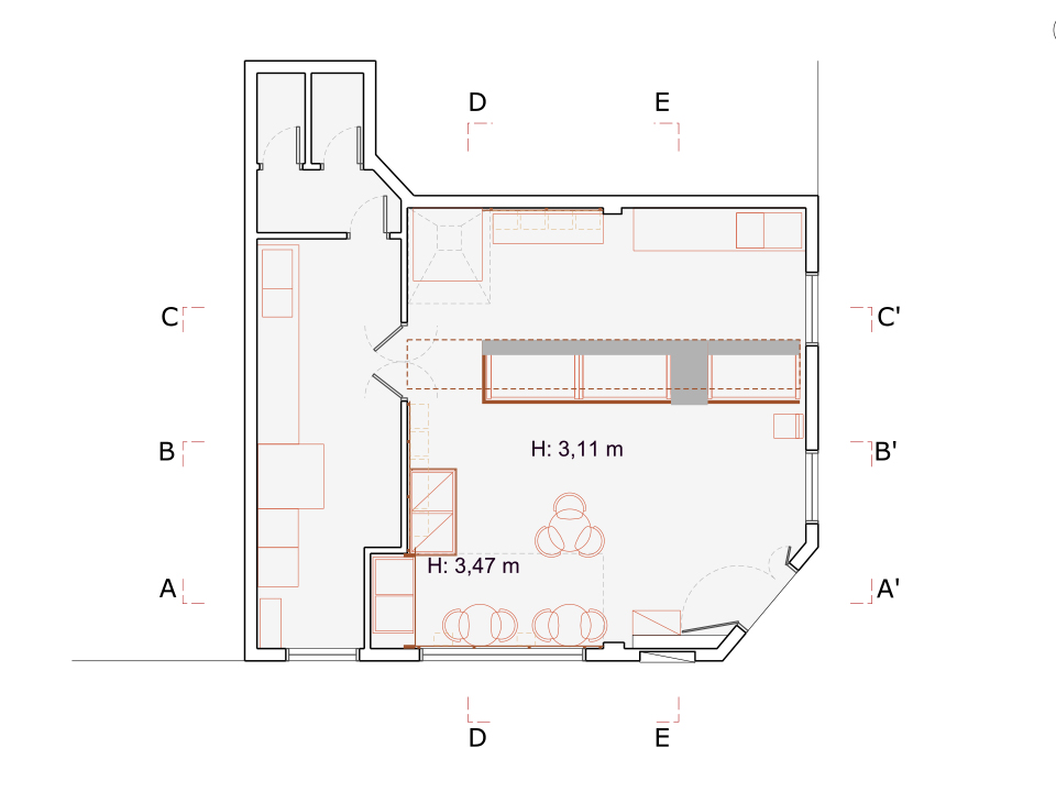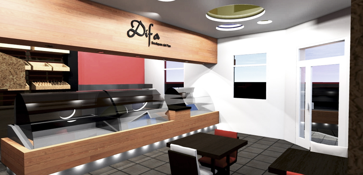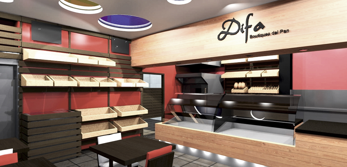 La empresa "Difa boutique´s del pan", con multitud de tiendas en la isla de Gran Canaria, pretende hacer un cambio de imagen de todos sus comercios con el fin de conseguir una imagen homogénea y actual. El cliente quiere conservar todas sus neveras de venta al público por lo que optamos en forrarlas con la misma madera, de igual modo proyectamos sobre las paredes unas lamas de madera donde se encajan unos cajones de madera iluminados para la venta de pan.