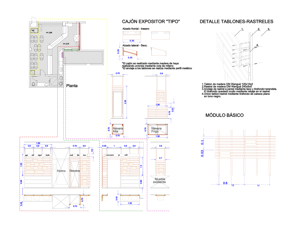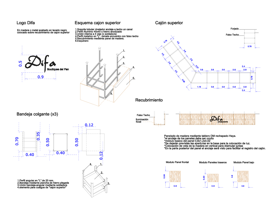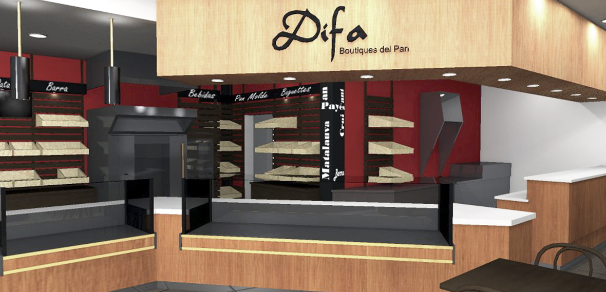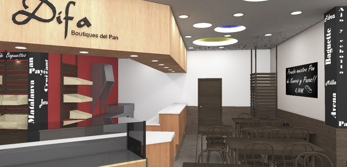 La empresa "Difa boutique´s del pan", con multitud de tiendas en la isla de Gran Canaria, pretende hacer un cambio de imagen de todos sus comercios con el fin de conseguir una imagen homogénea y actual. El cliente quiere conservar todas sus neveras de venta al público por lo que optamos en forrarlas con la misma madera, de igual modo proyectamos sobre las paredes unas lamas de madera donde se encajan unos cajones de madera iluminados para la venta de pan.
