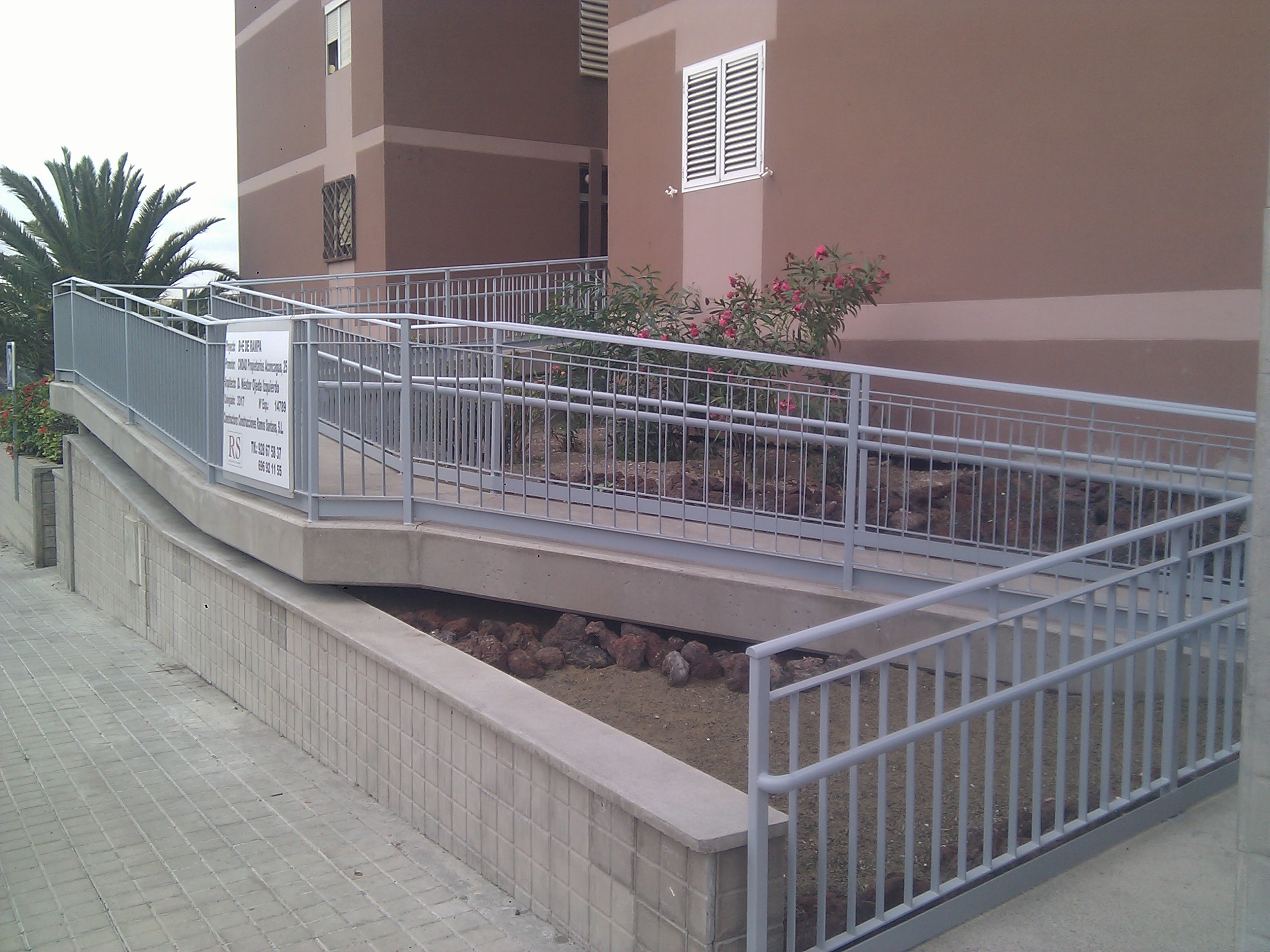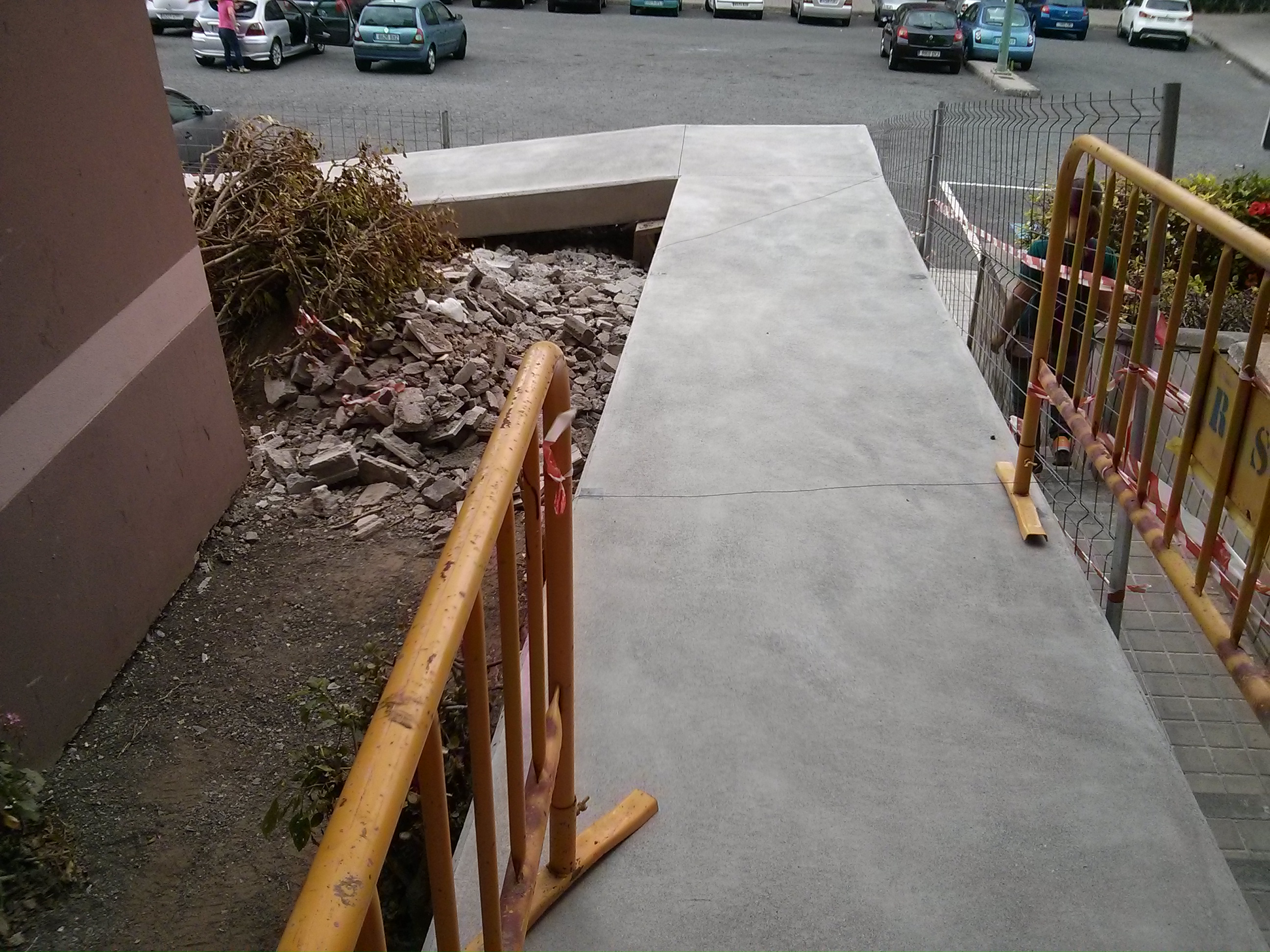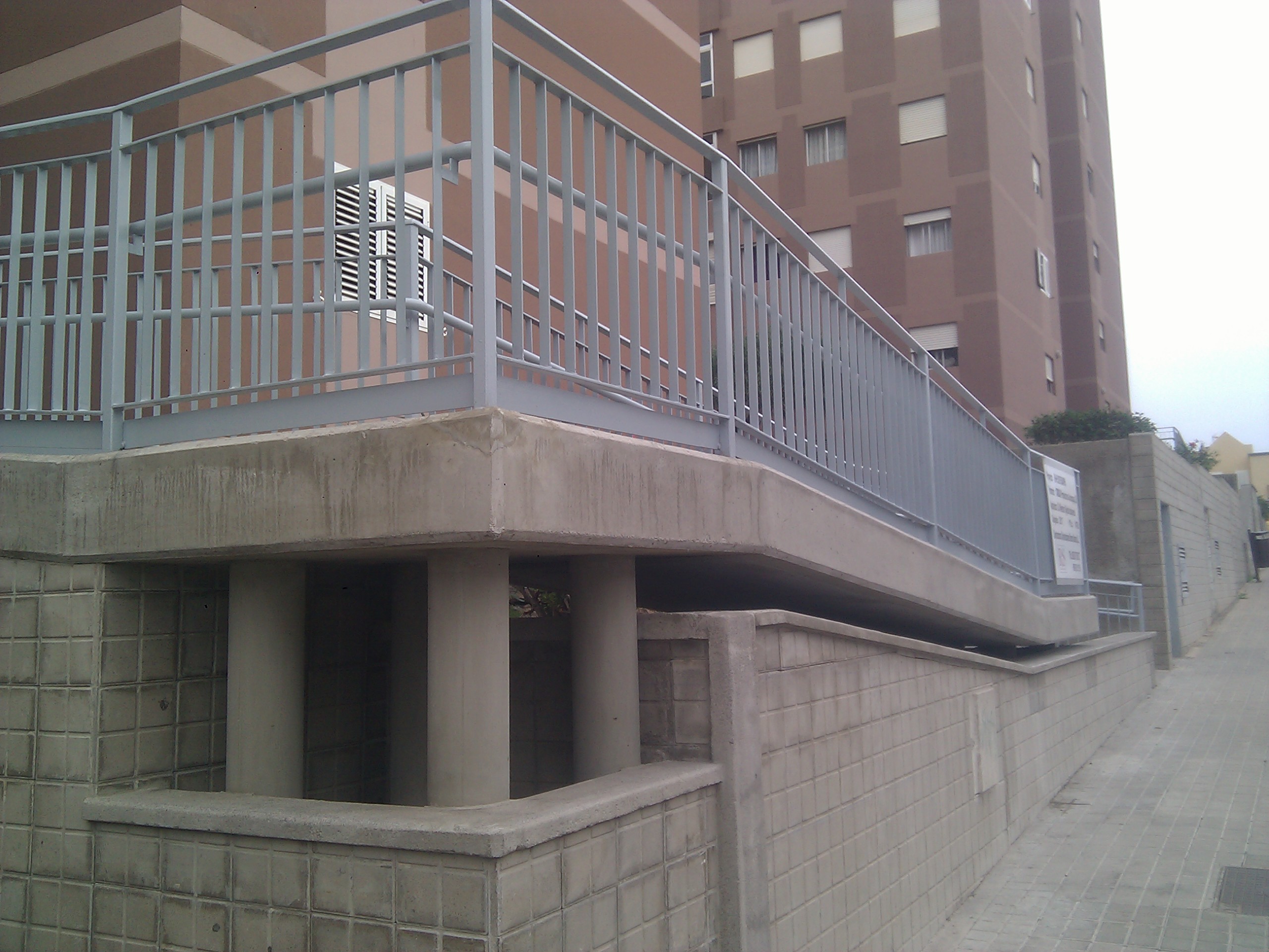 Se solicitó la realización de una rampa que mejorara la accesibilidad para salvar un desnivel entre el portal y la calle de más de 2 metros, la solución fue crear una rampa en el espacio libre exterior, comenzando desde el punto más favorecedor, respetando la intimidad de las viviendas evitando el contacto con el edificio en los puntos en que existen aperturas de la vivienda situada en los bajos.
